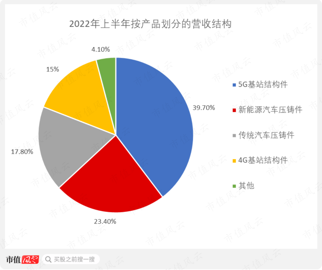 2022年上半年,通信基站结构件和汽车压铸件收入分别占营收的54.7%和41.2%。其中,5G基站结构件、4G基站结构件、新能源汽车压铸件以及传统汽车压铸件的收入占比分别为39.7%、15%、23.4%以及17.8%。