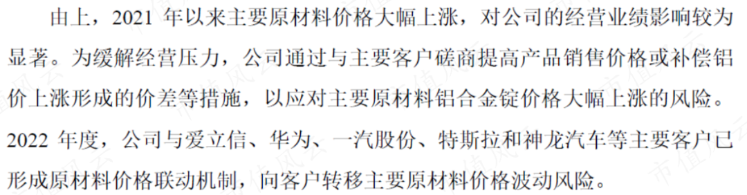 在该机制下,一旦铝合金锭的价格上涨,这些客户会允许公司调高产品价格,即允许公司将原材料价格波动的风险转移到客户这边。