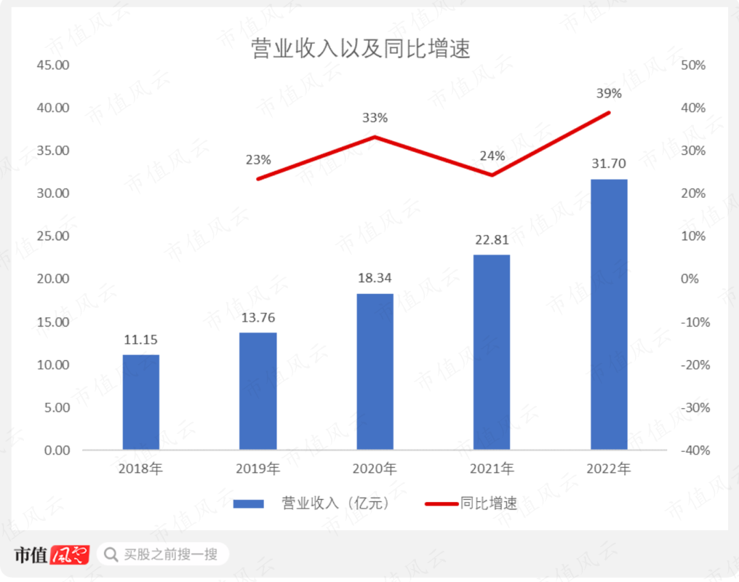 2018-2022年,公司营收从11.15亿元逐年递增至31.7亿元,累计增幅184%,期间CAGR达到29.85%。