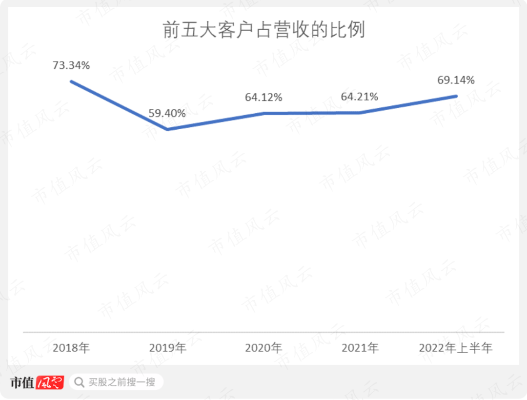 由于只聚焦于数量有限的优质客户,所以公司的客户集中度比较高。2018-2022年上半年,前五大客户占营收的比例最高可超过70%,最低也有60%。