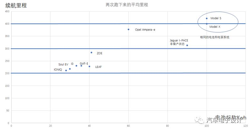 400公里以上:只有Model S和ModelX达到了,配置了100kWh的电池,虽然能耗较高,但是在真实的续航测试中也是能开到400公里的