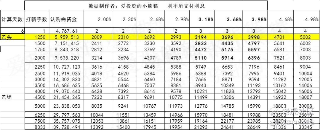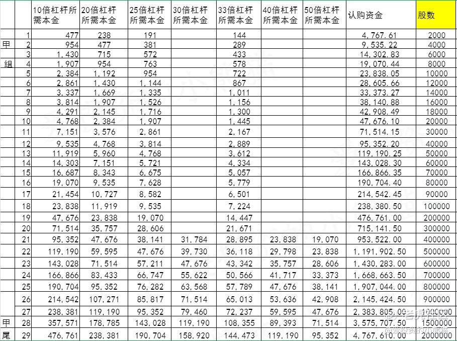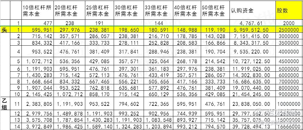 乙组头,这次是 596万本金,乙组的各档融资所需要的本金还有融资金额对应如下表: