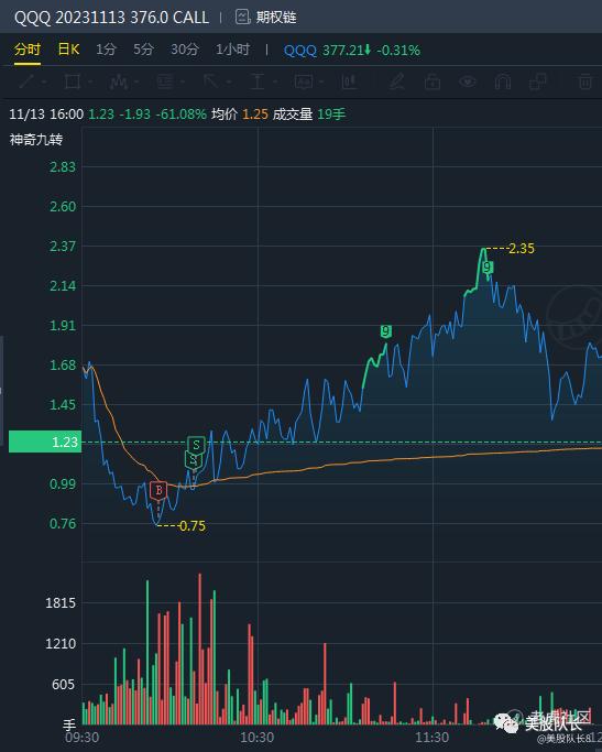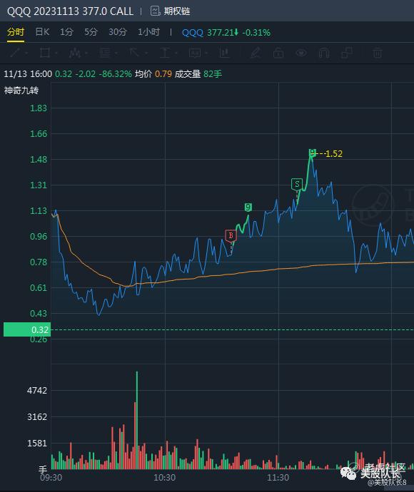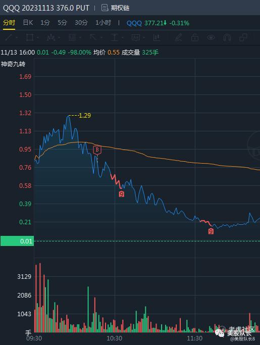 qqq低开继续下杀,第一个低点有个小反弹,当时在观望没有操作,然后继续下探。这时候我观察盘面还是要继续跌的(根据经验80%的概率今天大方向是下跌的),但是目前qqq已经下跌0.8%,预期今天整体是个窄幅行情(震幅不会超过1.2%),所以预计会反弹,这时候就果断下了一个看涨末日期权。 $纳斯达克(.IXIC)$