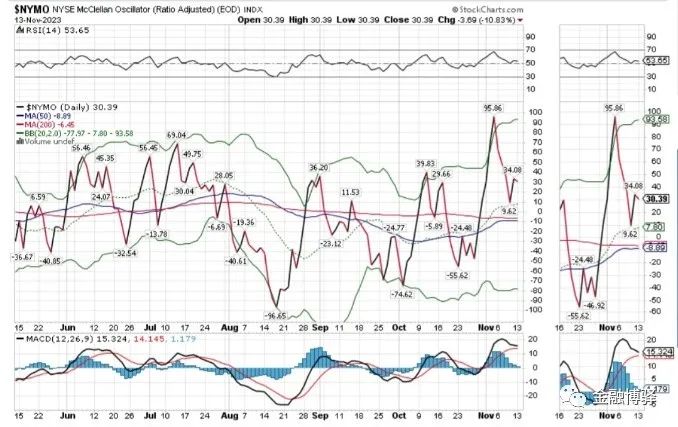 3. NYMO:NYSE McClellan Oscllator用纽NYSE的上涨家数和下跌家数来判断市场(1)计算(上涨家数-下跌家数)的19日和30日指数移动平均;(2)绘制(19日指数平均-39日移动平均)的计算结果