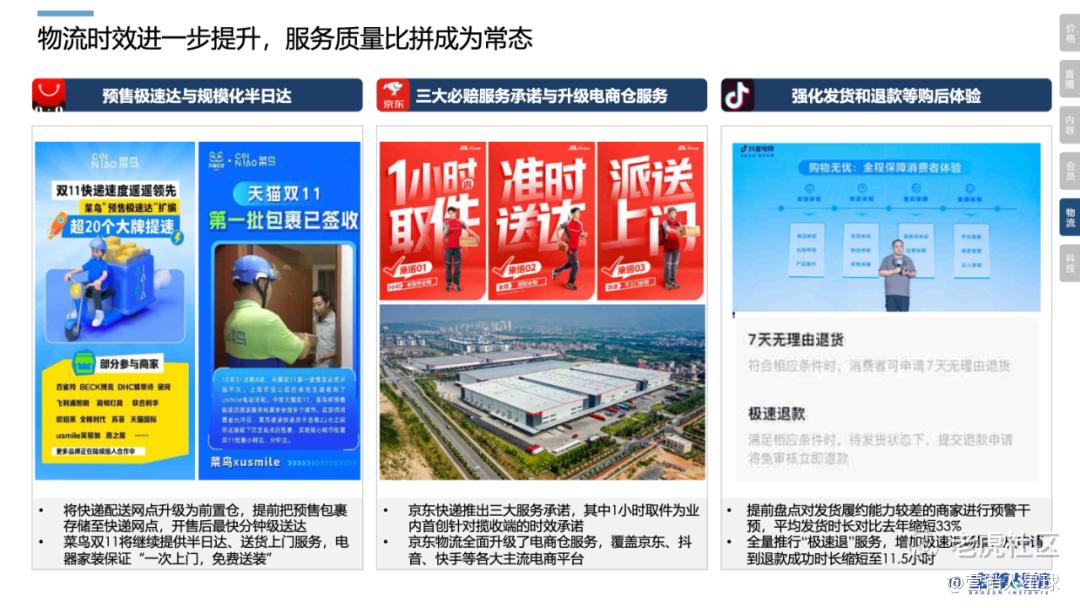 为了提升消费者的购后体 验,平台持续在物流时效 性上加码,物流服务种类 越来越细分。
