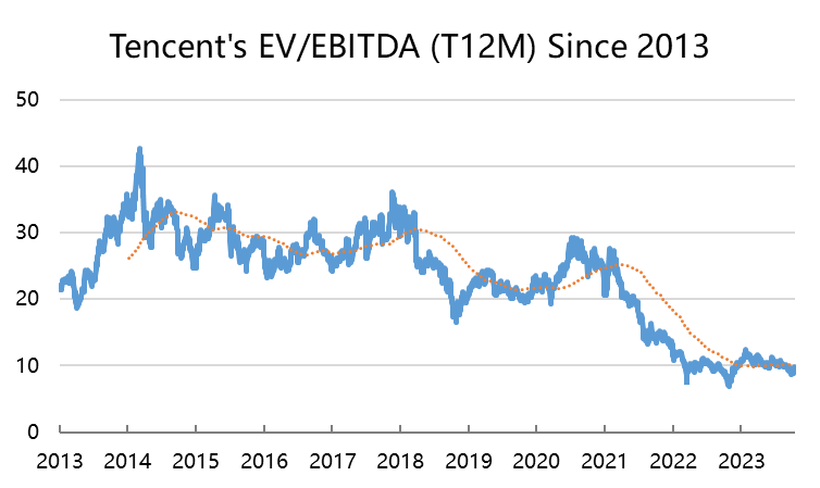 估值上看,腾讯的利润倍数依然处于过去10年中极低的位置,过去12个月的PE为14.3倍,远低于10年平均水平31倍;过去12个月的EV/EBITDA为9.8倍,远低于10年平均水平23倍。