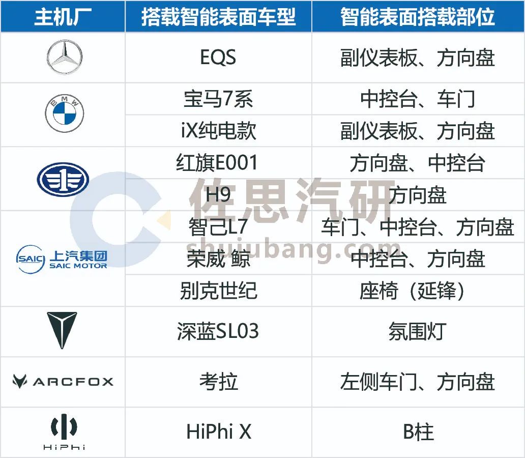 搭载智能表面的部分车型