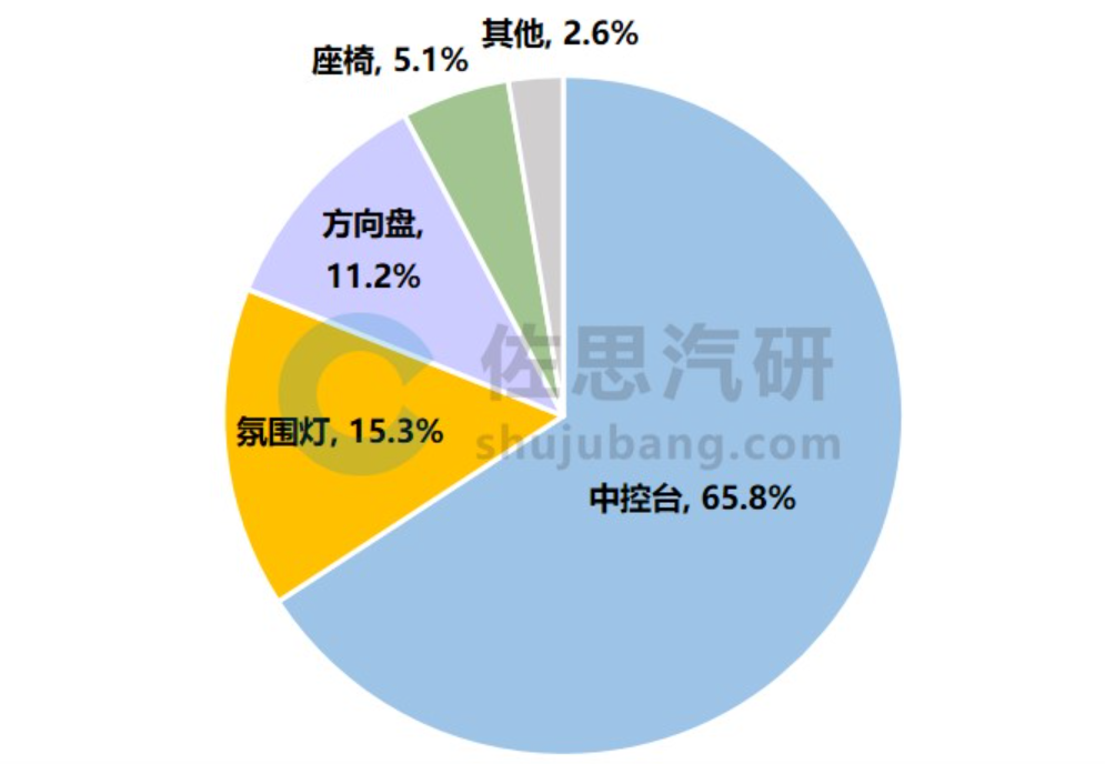 智能表面在车内可以装在中控台、氛围灯、方向盘、车门、座椅等部位,2023年1-9月,搭载智能表面的车身部位主要为中控台、方向盘、氛围灯。
