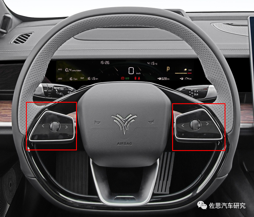 吉利极氪X的方向盘采用“触控按键+实体按键”共同操作的模式,在方向盘下方安装触控板,实现后备箱开关、车前玻璃加热等功能。