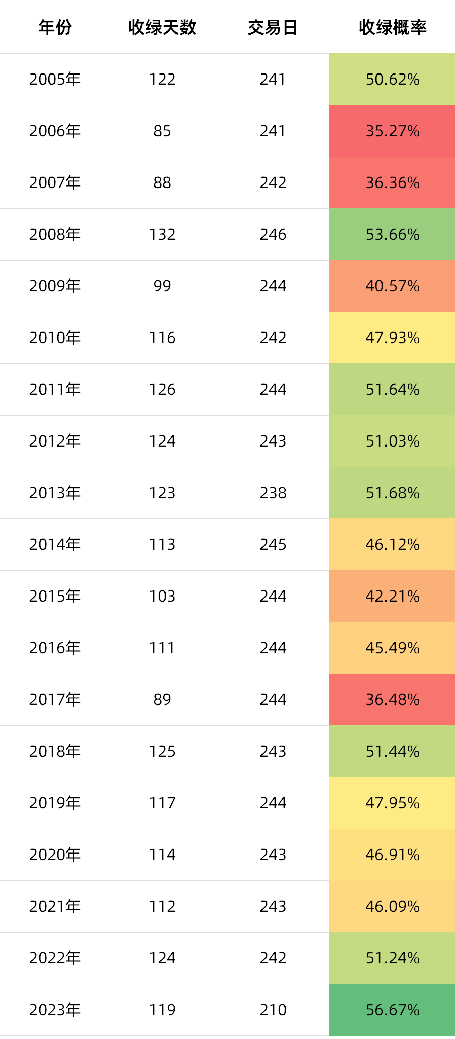 沪深300发布至今,日K线收绿的整体概率不到47%。
