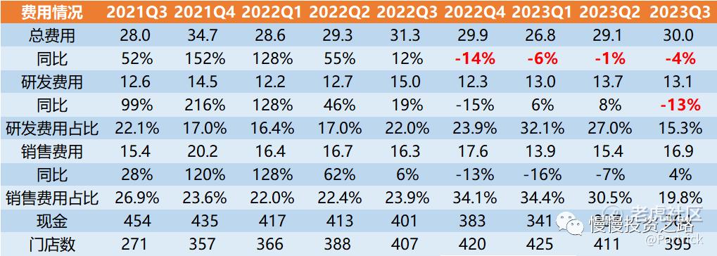 三季度,小鹏总费用30亿,同比减少4%,研发费用13.1亿,研发费用同比下降13%,占比下降到15.3%,销售管理费用上涨了4%。门店数Q4进一步减少了16家,王凤英上台后费用继续在砍,特别是研发费用这块,对小鹏来说提升效率很重要,这方面不能学习蔚来。