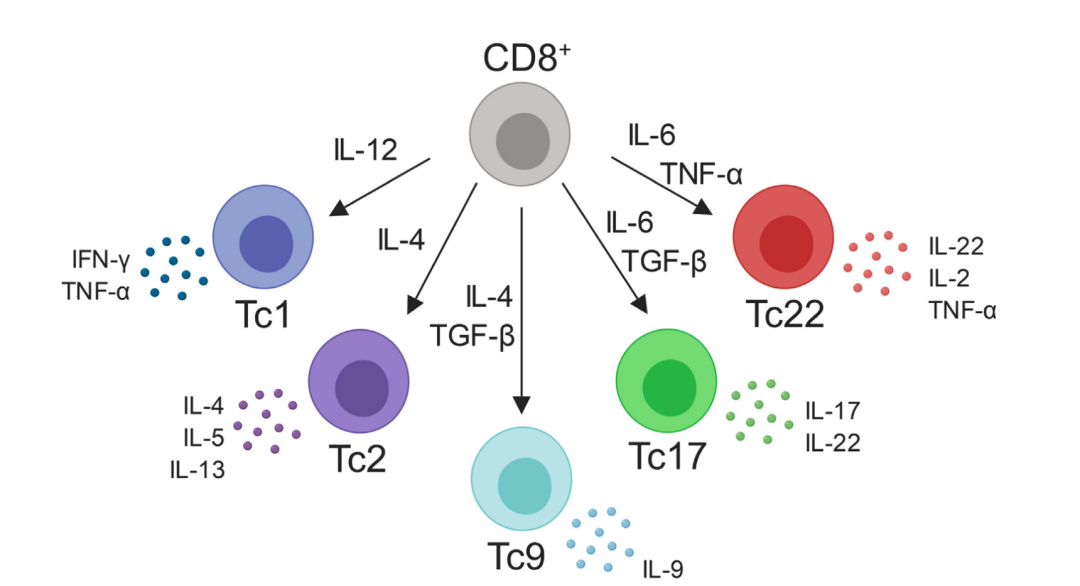 Tc9细胞产生IL-9,同时产生相对较少的IFN-γ,Tc9细胞谱系是否不同于Tc2细胞仍有待完全确定。然而,Tc9细胞的极化条件已经确定,包括细胞因子IL-4和TGF-β的联合作用,由转录因子STAT6和干扰素调节因子4 (IRF4)介导。与Tc1和Tc2细胞不同,Tc9细胞表现出较差的细胞毒功能,部分原因是它们有限地产生颗粒酶B。Tc9细胞的生物学相关性以及它们的细胞毒性目前尚不清楚。在小肠、特应性皮炎病灶和哮喘患者的血液中均可检测到Tc9细胞,它们被认为可促进疾病进展。