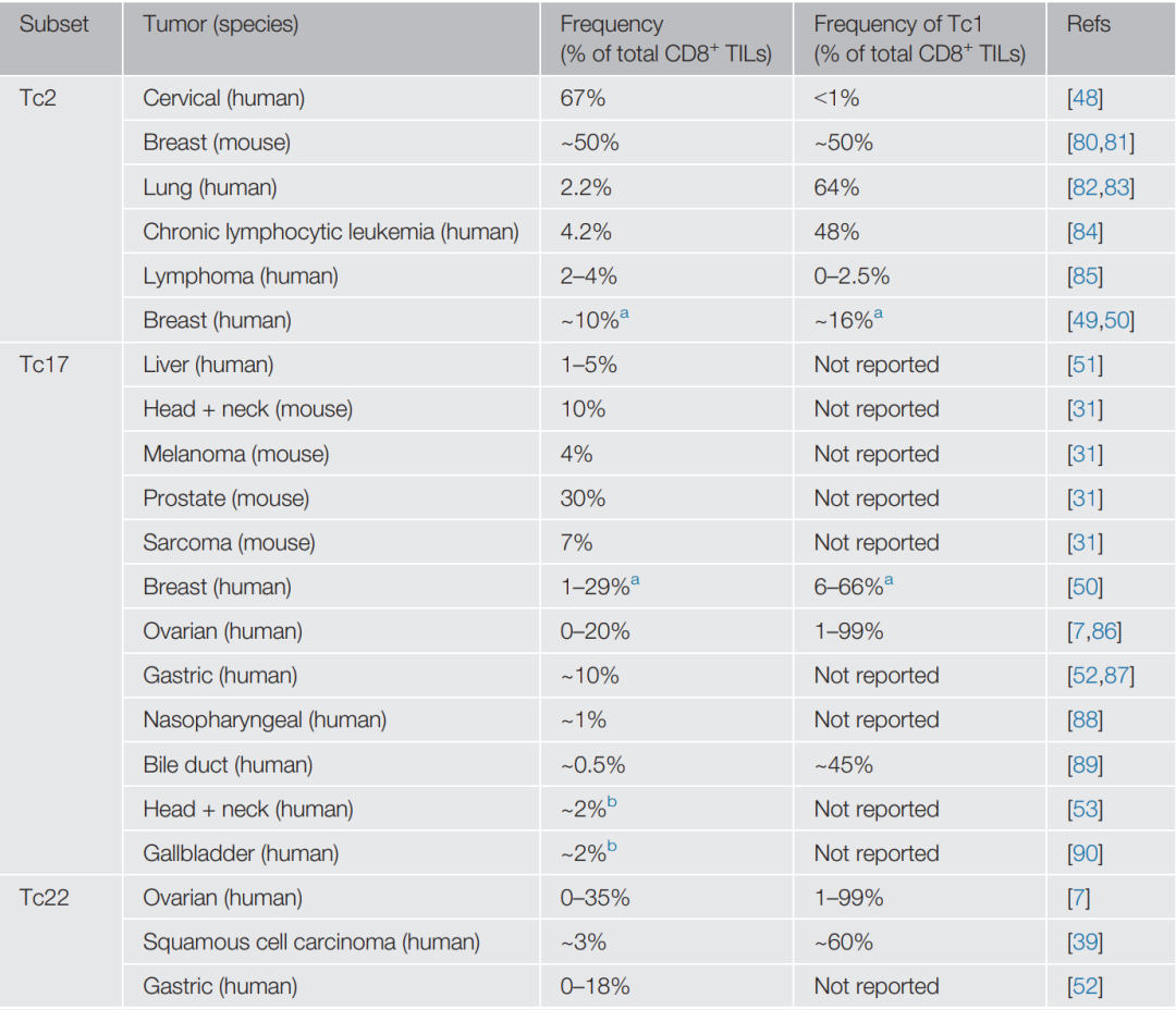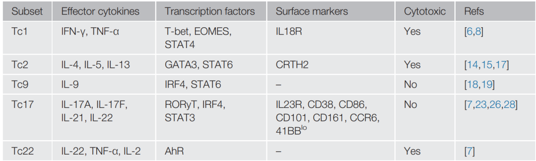 CD8+ T细胞通常被认为是一群分泌大量IFN-γ和蛋白酶颗粒酶B的杀伤性T细胞,它们可以直接发挥杀死感染细胞或癌细胞的功能。然而CD8+ 效应T细胞亚群具有很强的多样性。除了调节性和滤泡性CD8+ T细胞群外,各种类型的效应性CD8+ Tc亚群与CD4+辅助性T细胞亚群相对应。每个CD8+ Tc亚群在抗肿瘤免疫反应中具有不同的功能和潜在的作用。迄今为止,已经鉴定出几种CD8+ Tc亚群,包括传统的产生IFN-γ的Tc1s、产生IL-4的Tc2s、产生IL-9的Tc9s、产生IL-17的Tc17s和产生IL-22的Tc22s(图1)(表1)。
