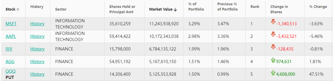 前五大重仓股中,iShares核心美国综合债券ETF(AGG)位列第四,持有约5495.12万股,市值约51.68亿美元。较上一季度增持1.81%,占投资组合比例为1.51% 。