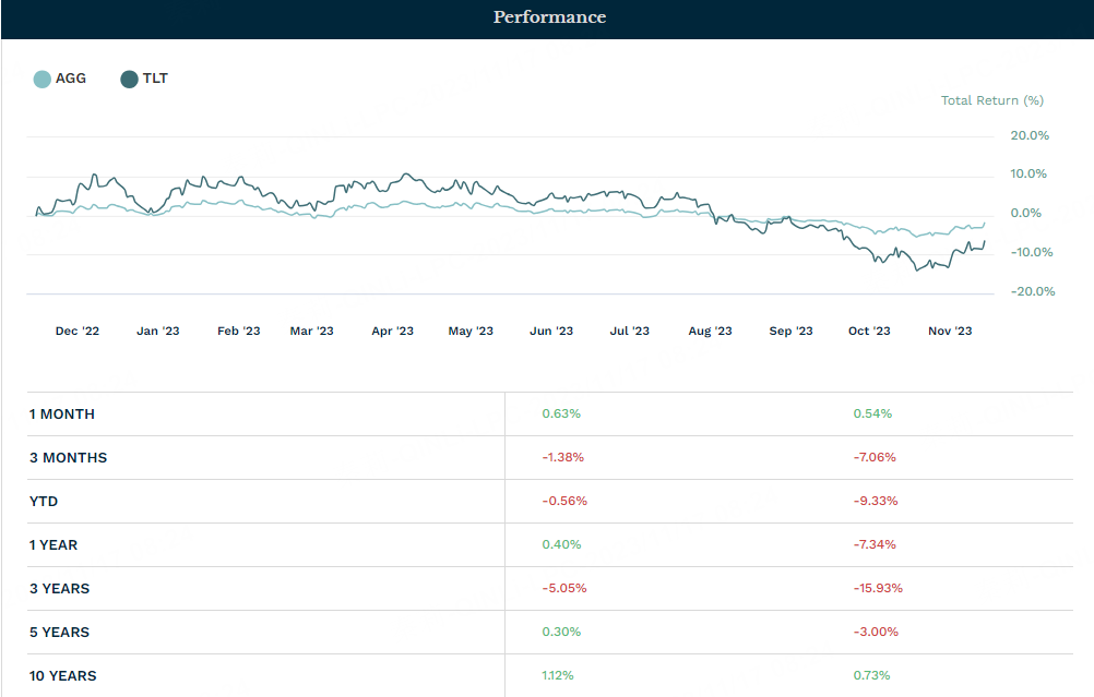 AGG: AGG的风险相对较低,适合那些寻求相对稳定收益和资本保值的投资者。然而,其潜在回报也较为稳定,相对于长期国债而言可能较低。