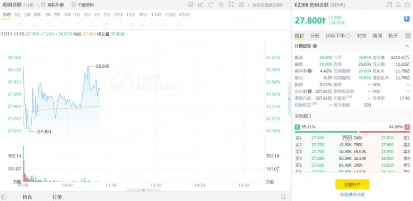 在昨日的暗盘交易中,药明合联报价25.15港元,较招股价20.6港元涨幅高达22.09%,按每手500股计算的话,每手可以赚2275港元!而在今日开盘之后,药明合联也是延续了上涨的态势,一度大涨近40%![Yummy]