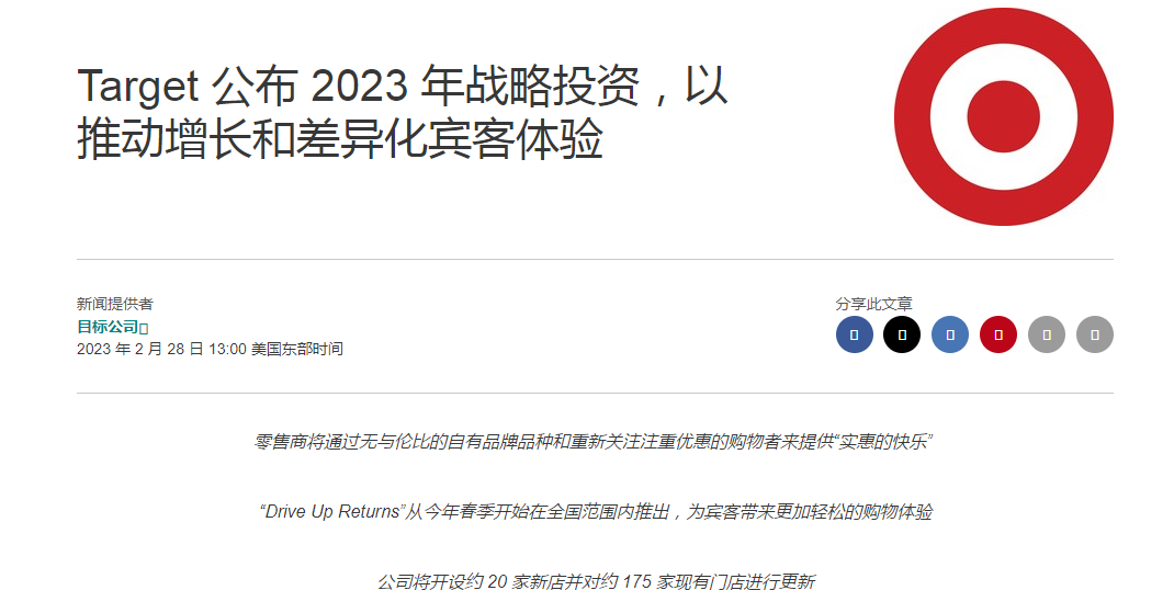 总体来说,2023年第三季度,Target交出了一份令人满意的成绩单。在第三季度财报发布后,Target的股价应声大涨18%,亦说明市场对这一零售巨头的看好。就像Target公司董事长兼首席执行官Brian Cornell所说的那样:“该季度,我们的团队继续成功地引导我们的业务度过充满挑战的外部环境,不仅销售额符合我们的预期,而且每股收益也遥遥领先我们的预测。”