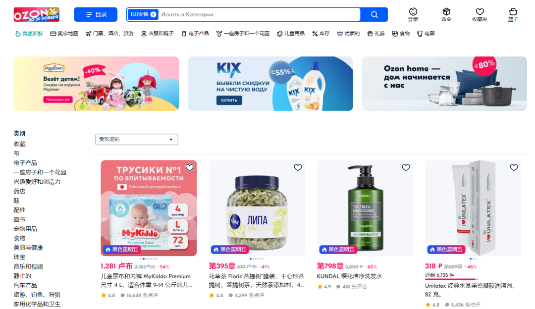 据俄罗斯电商巨头Ozon发布的数据显示,在今年11月9日至11月11日为期三天的促销期间内,平台销售额超过300亿卢布。尤其是在11月11日当天,Ozon上的订单数量超540万个,且大额订单非常多。