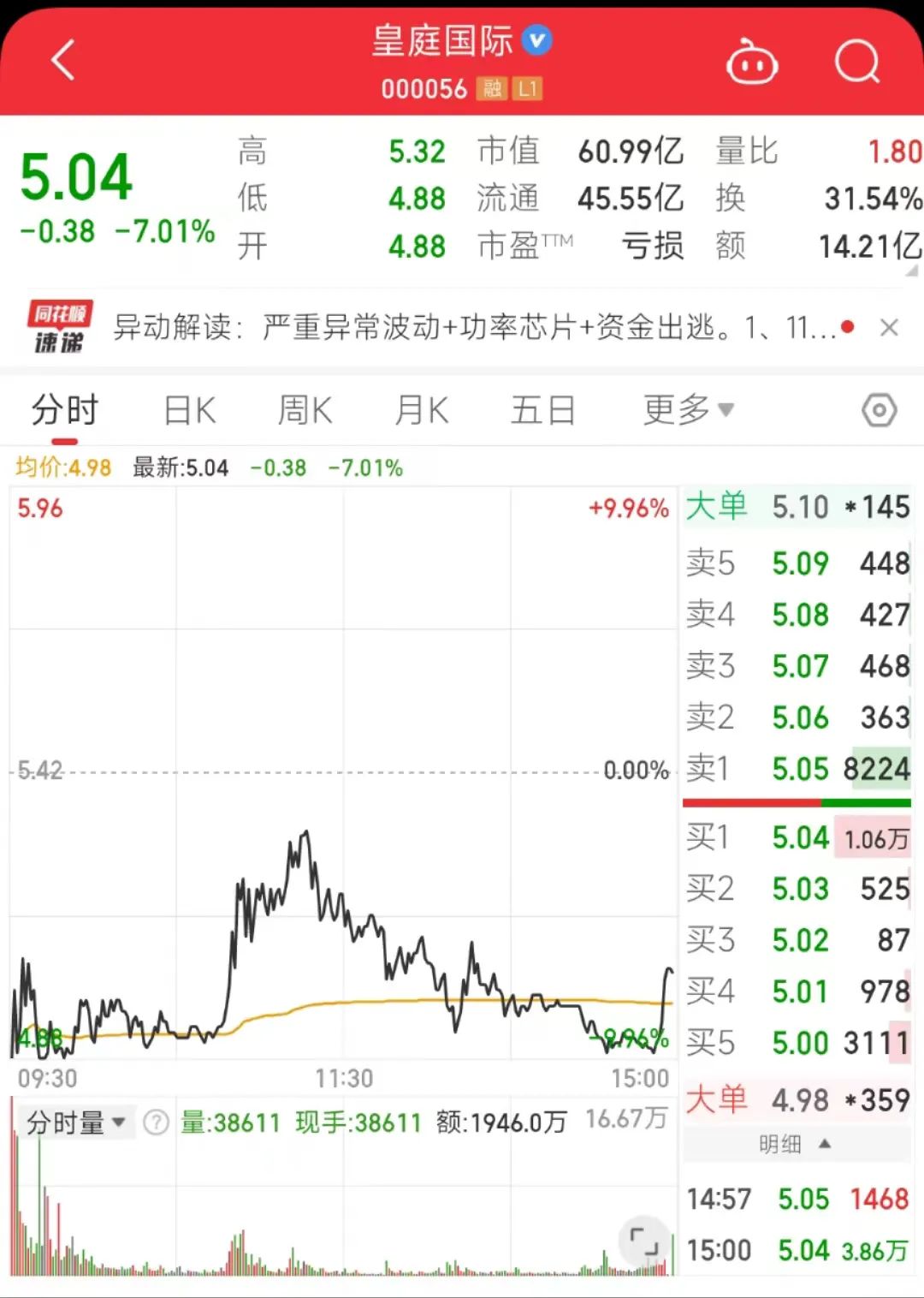 11月16日,皇庭国际在连续走出7个涨停板后跌停,报5.42元/股。11月17日继续大跌7.01%,股价为5.04元/股,市值为60.99亿元。