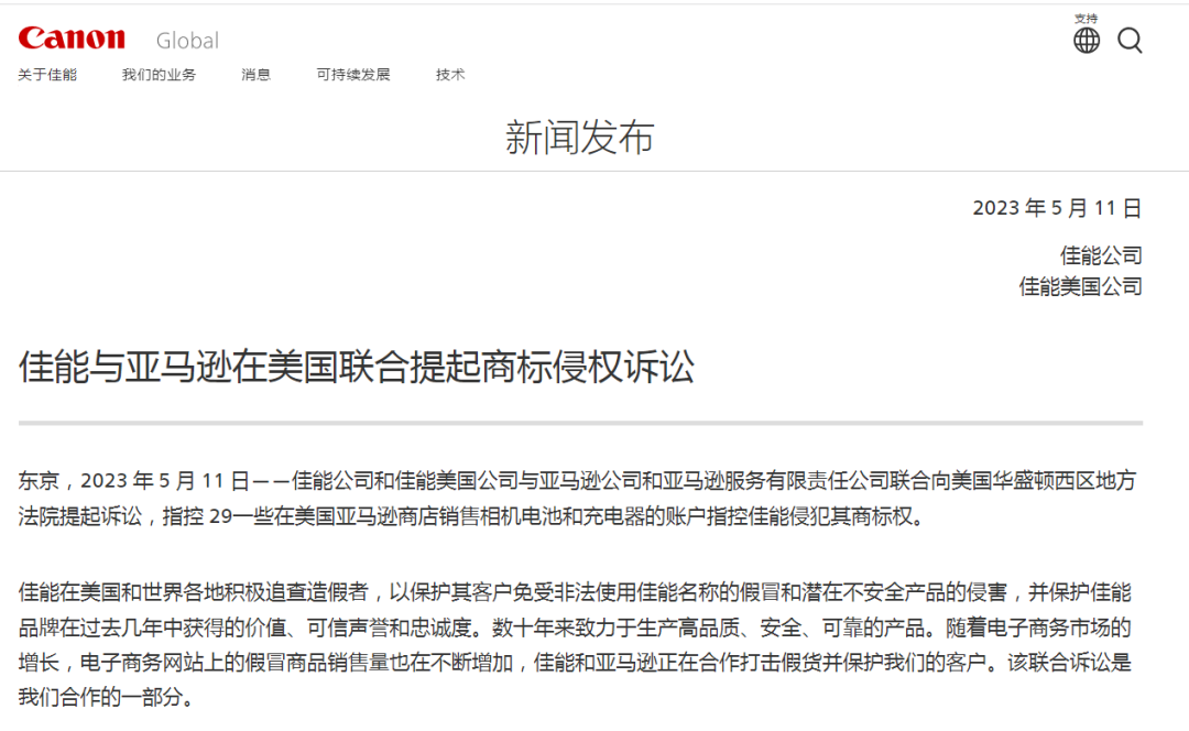 佳能联合亚马逊提起诉讼 图源:global.canon