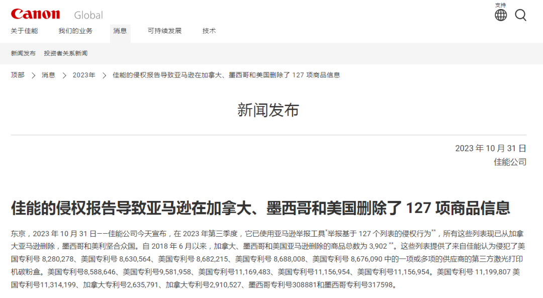 佳能方面表示:“此次大多数涉及侵权的产品为亚马逊第三方卖家销售的佳能激光打印碳粉盒,这些卖家侵犯了佳能在欧洲、美国、加拿大以及墨西哥的多个专利号。”