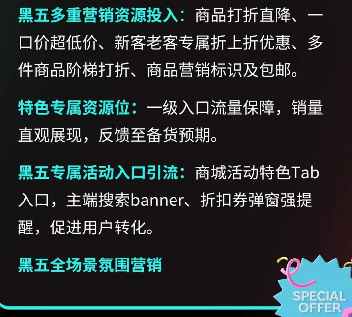 早在9月份,TikTok Shop就开始为号称年度最大规模的黑五大促积极做着准备,希望最大限度发挥平台资源优势,帮助卖家收割更多的旺季流量。比如说在货架场上,TikTok Shop多重叠加黑五营销资源,放出商品打折直降、一口价超低价、新客老客专属折上折优惠等等大额折扣来刺激消费下单。