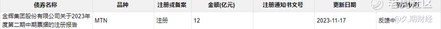 久期财经讯,11月17日,据中国银行间市场交易商协会的非金融企业债务融资工具注册信息系统显示,金辉集团股份有限公司(简称“金辉股份”)的债务融资工具状态已更新如下:
