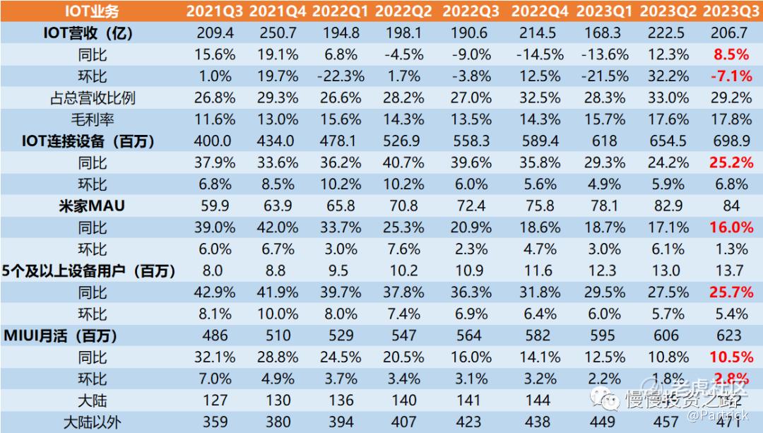 刚刚 $小米集团-W(01810)$ 公布了2023年Q3财报,整体看,财报数据还是超市场预期,延续了Q2良好的表现。其中Q3营收708.9亿元,同比增长0.6%,时隔6个季度后终于恢复增长,超市场预期的704.64亿元,经调整后的净利润59.9亿元,同比增长182.9%,远超市场预期的46.5亿元。整体毛利率创新高,达到22.7%。