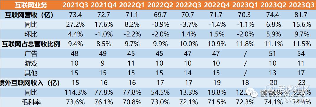 互联网业务81.7 亿元,创历史新高,同比增长15.6%,占总收入占比11.5%,连续2个季度同比增长。
