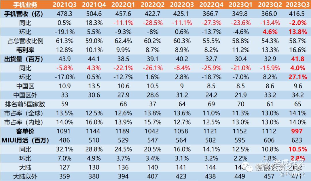 手机业务其实差不多是明牌,Q3的销量之前就有数据。Q3全球市场来看,小米出货量4150万台,市占率依旧排名第三,但已经是TOP里面唯一实现正增长的手机厂家。但由于ASP的下降,本季度手机业务收入416.5亿元,同比减少2%,环比提升13.8%。