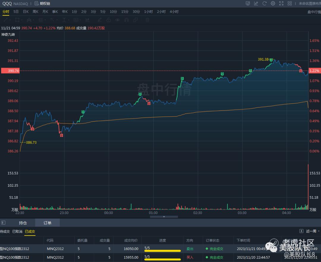 当时设置的止盈点比较保守,因为前几天的震荡走势振幅都很小,不到0.8%,今天单边走势振幅1.2%。但是大段的肉还是吃到了,做得也比较轻松,所以整体还是不错的。 $纳斯达克(.IXIC)$