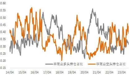 从CFTC持仓来看,上周非商业空头持仓占比环比继续增加,多头持仓占比继续下降。目前空头占比回升至近期中位数附近,考虑到持仓数据的滞后已经近期的上涨,预计目前空头占比可能已经回落至相对低位水平。