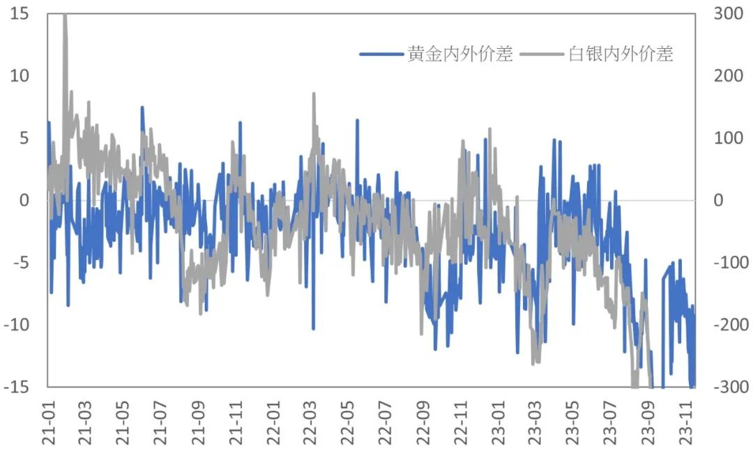上周黄金与白银内外价差持续回升;人民币汇率对内盘价格产生支撑,黄金、白银内外比价随之持续上行。