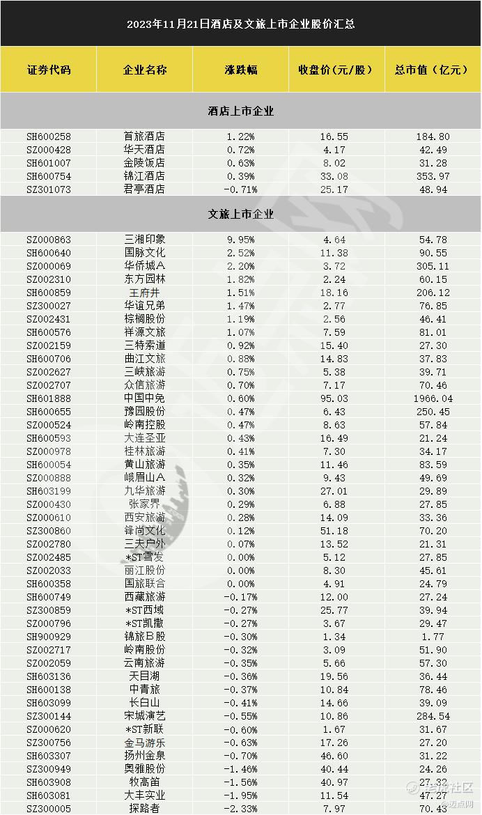 酒店个股方面,首旅酒店(SH:600258)收涨1.22%,报收16.55元/股;华天酒店(SZ:000428)收涨0.72%,报收4.17元/股;金陵饭店(SH:601007)收涨0.63%,报收8.02元/股。