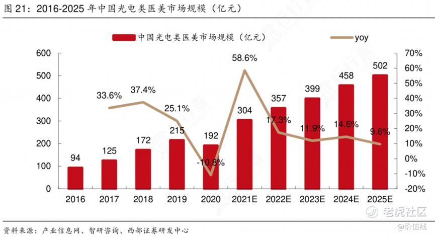 从行业前景看,奇致激光核心产品服务的光电医美项目价格亲民,风险小,具备普惠性基因,是轻医美中最核心的赛道,如热玛吉、超声炮、光子嫩肤、黄金微针等光电医美项目在社交平台中陆续爆火。根据产业信息网数据,预计2025年中国光电类医美市场规模将达502亿元,2020-2025年预计复合增速可达21.2%,各种激光色素管理、光子嫩肤、射频能源类医美项目有望成为医美主流市场。