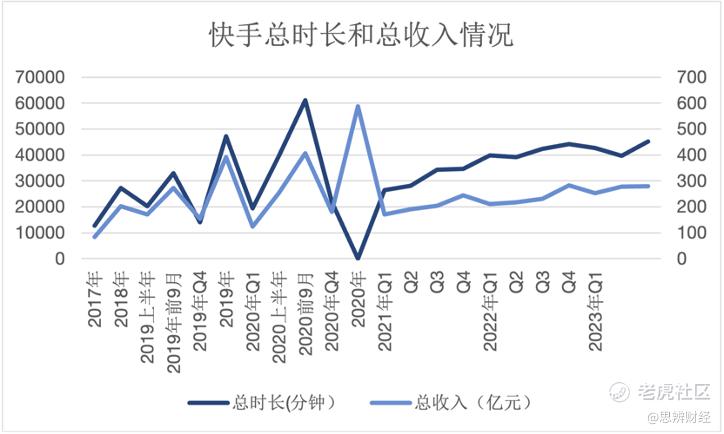 在大多数时间内,两条折现表现出了非常高的一致性,直到2022年之后,快手用户使用总时长仍然展示了较高的增速,但另一方面总收入的表现则相对平滑。