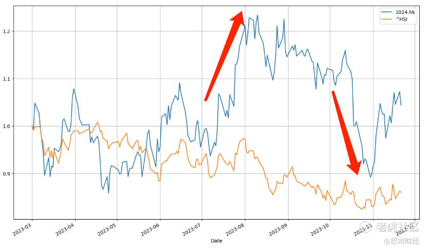 我们整理了今年3月以来(2022年末后的小牛市尾声)快手与恒生指数的波动情况,将基准设为“1",如上图所示。