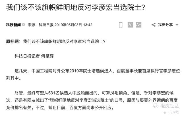 2019年5月3日,科技部旗下的科技日报撰写了《我们该不该旗帜鲜明地反对李彦宏当选院士?》一文。