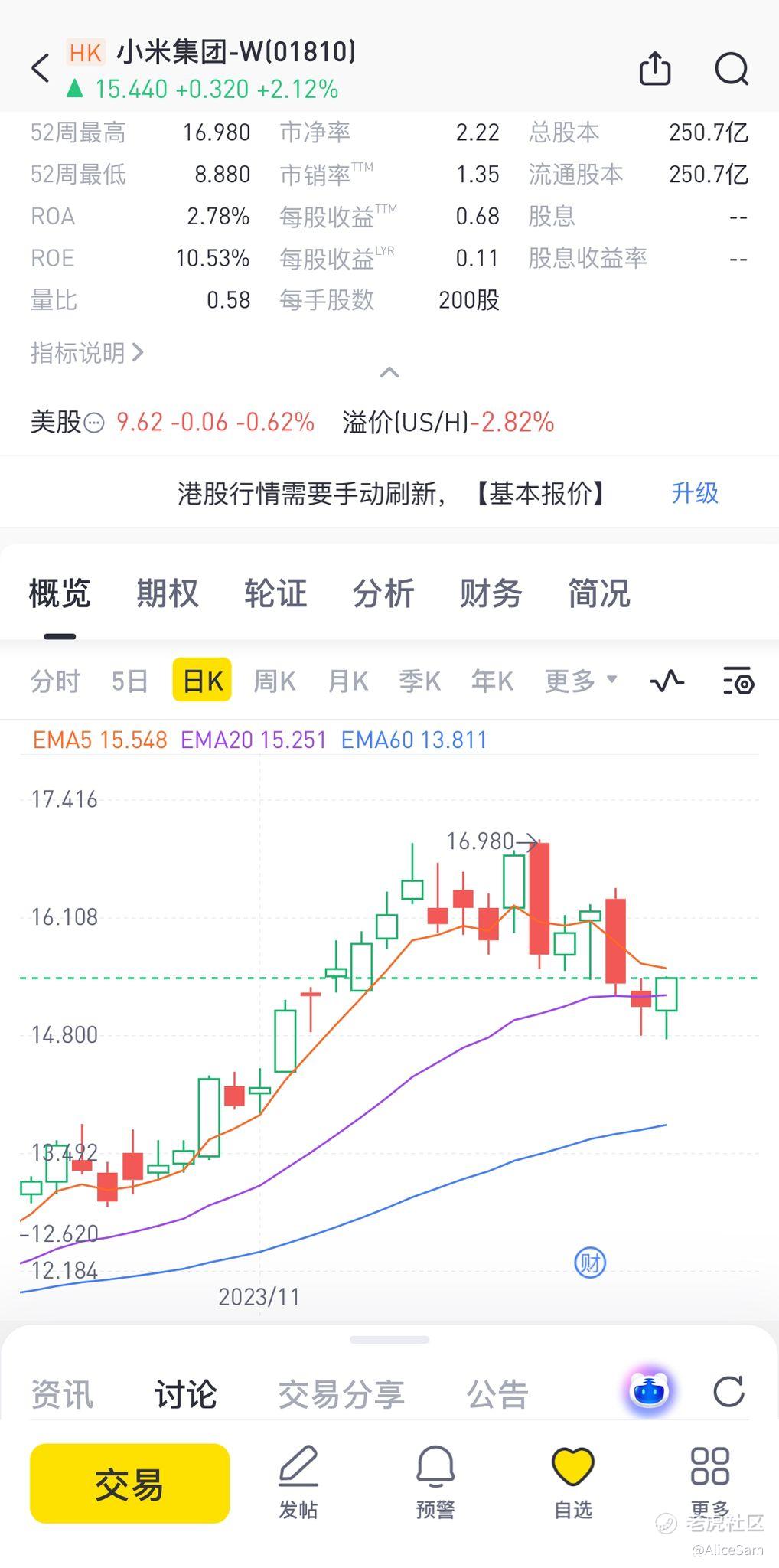 我是米粉,非常忠实的那种老米粉。我买了很多小米产品,小米电视,红米手机,扫地机,电饭煲,空气净化器,烧水壶等等。当然,我也持有 $小米集团-W(01810)$ 的股票。前几天小米公布了Q3财报,显示营收和利润皆超预期,可以说是近几年来最优秀的一份财报,手机业务在复苏,电动车也在继续推进。我满心欢喜的觉得股票肯定能大涨特张,不冲35不罢休, 回本 回本 我要回本,我觉得这次应该能回本了。