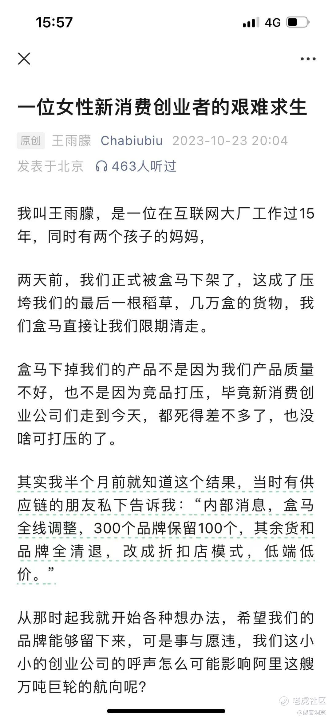 今年9月,有媒体报道透出消息称盒马在香港上市的计划搁置,因市场消费股投资气氛低迷,上市后估值远低于预期;10月“盒马线下降价引发会员不满” 话题上了热搜;同期,一则名为《一位女性新消费创业者的艰难求生》的文章在网上走红,盒马的供应商在文中控诉其因盒马“折扣化改革”而被迫下架产品。