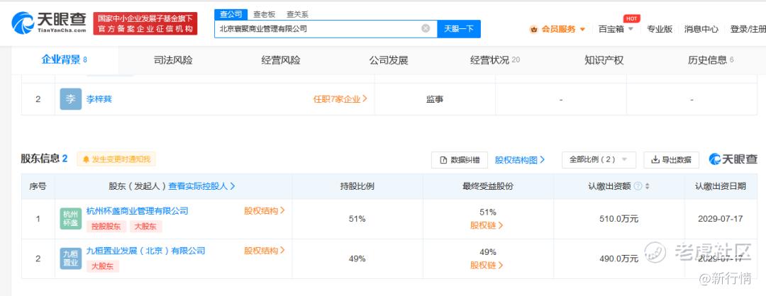 北京寰聚有两家股东杭州杯盏商业管理有限公司(以下简称杭州杯盏)、九桓置业发展(北京)有限公司,持股比例分别为51%和49%。