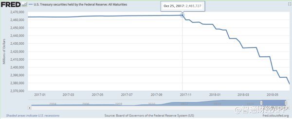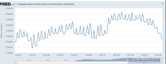 首先,美联储持有的美国长短国债跟据美联储的公告由2017年10月开始到2018年5月31日当周计,美联储由USD2,465,727,000,000减至USD2,387,103,000,000。为期7个月,即每个月约100亿美元,比之前公布的60亿为高。其次为按揭抵押债券(MBS),因为MBS支付不同于一般债券,是具有特殊性的,有时减债的传递会出现2-3个月的延迟,才能真正反映在资产负债表上。由2017年10月计到2018年5月,共减少约480亿美元。即每月减少约68亿。