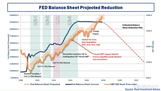 美国自量化宽松以来,出现了持续十年的牛市。但在2017年年中,美国宣布缩表。在2008年金融危机之前,美联储资产负债表规模不到9000亿美元,美联储推QE(量化宽松)向市场注资,令资产负债表扩张,规模从金融海啸前约9000亿美元膨胀至现在约4.5万亿美元(约35.2万亿港元)。缩表就是要将4.5万亿美元的资产降低,回收市场巨大流动性。按当局早前披露的缩表计划,首先将到期债券再投资规模每月减少100亿美元,当中美债及按揭证券分别占60亿及40亿美元,之后逐季以同等幅度递增,直至每月缩减规模达到500亿美元。