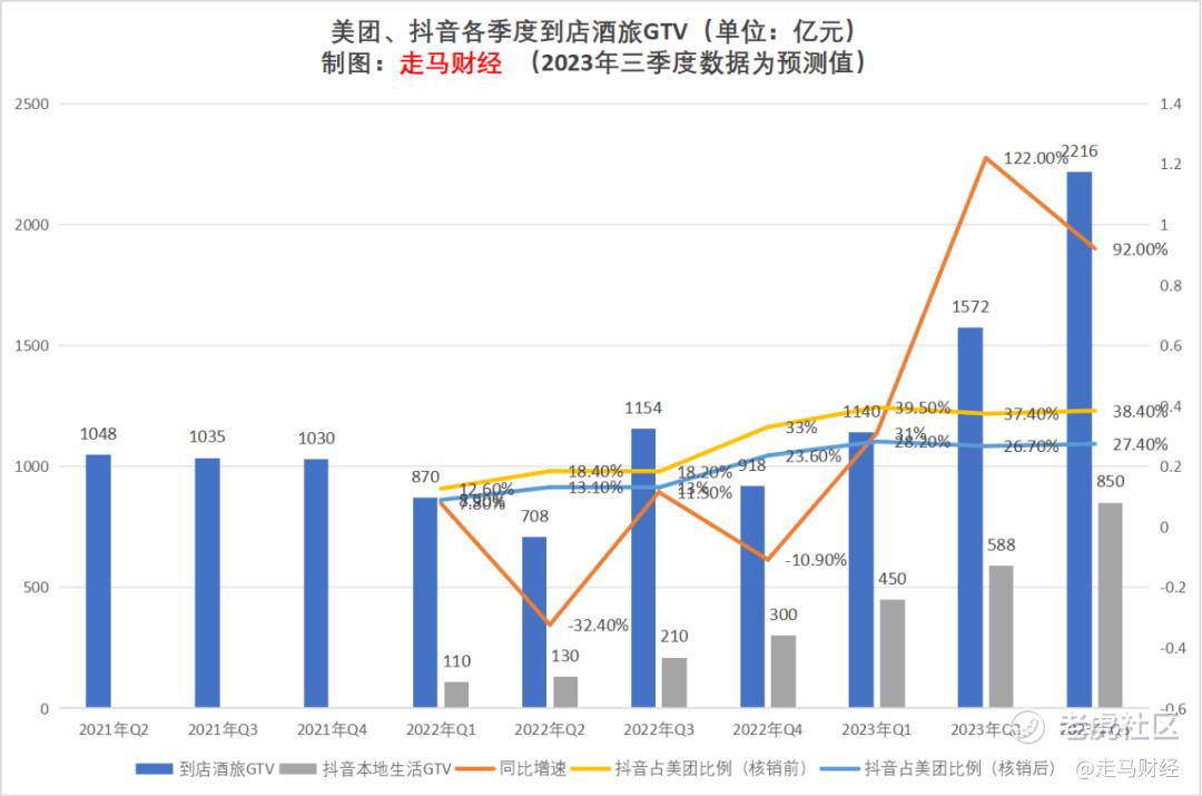 三季度美团到店酒旅GTV同比增速约92%,达到约2216亿,抖音本地生活(含到餐、到综与酒旅)约850亿。