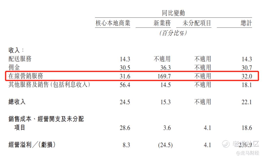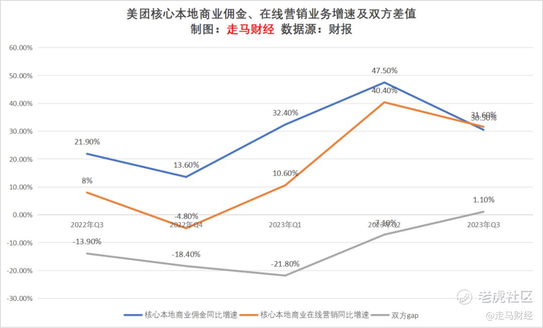 另一个值得重点关注的数据,是美团核心本地商业中“在线营销服务”同比增速的变化,2022年Q3-2023年Q3五个季度,这一数据指标分别是: