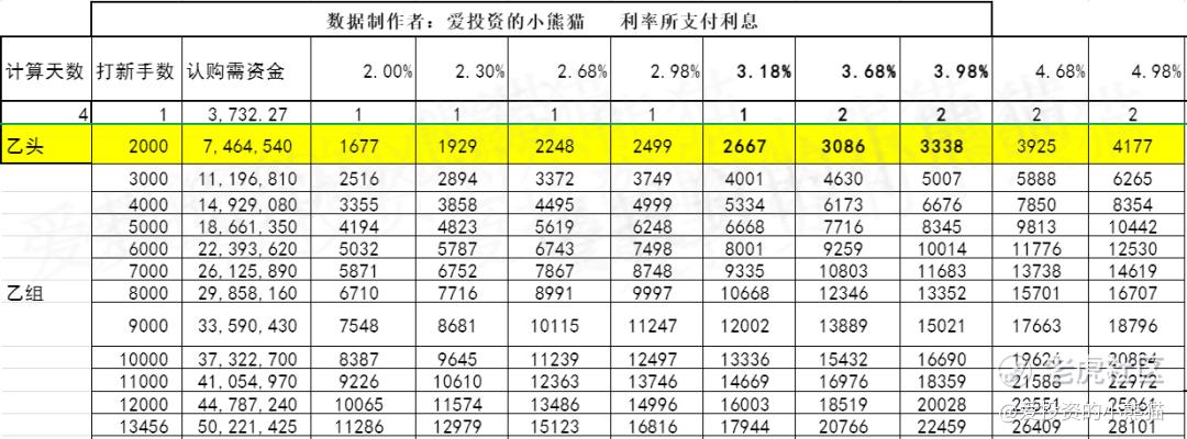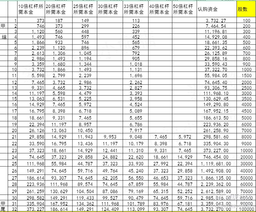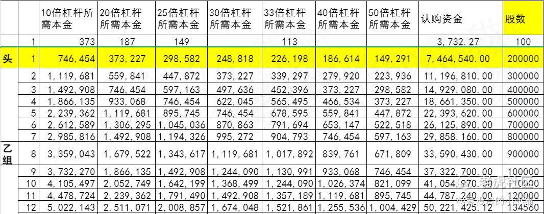 乙组头,这次是 747万本金,乙组的各档融资所需要的本金还有融资金额对应如下表:
