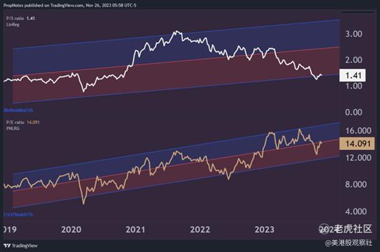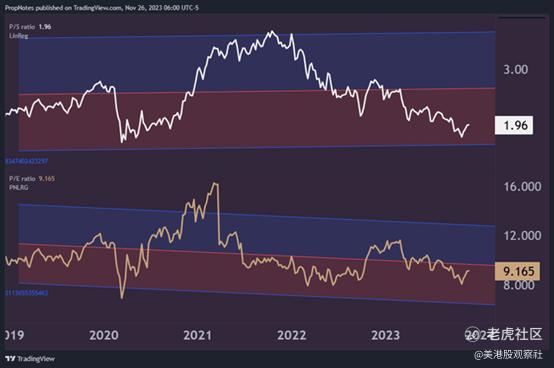 在销售额和利润收益方面,摩根士丹利的交易估值处于其历史回归/偏差范围的低端,分别为1.41倍的销售和14倍的收益: