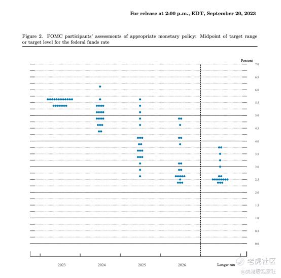 上面的点阵图显示了FOMC成员对未来几年货币政策的预期。正如你所看到的,有一个普遍的下降趋势,大多数成员预计到2026年利率将低于3%。