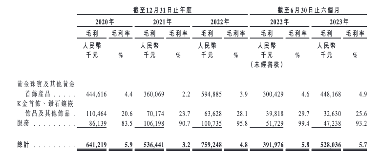 素金饰品占比高,毛利率不足6%
