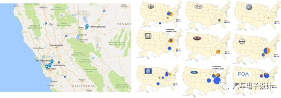 图2 特斯拉在加州和内华达州建立的工厂与其他公司的布局